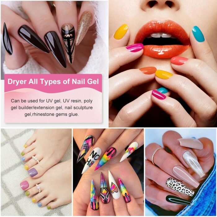 Cure All Nail Gels:This uv nail light apply to most UV/LED gel, Top coat, base gel, colour gel, builder gel, nail sculpture gel, acrylic gel etc. But all gel uv led nail lamp can not dry regular polish